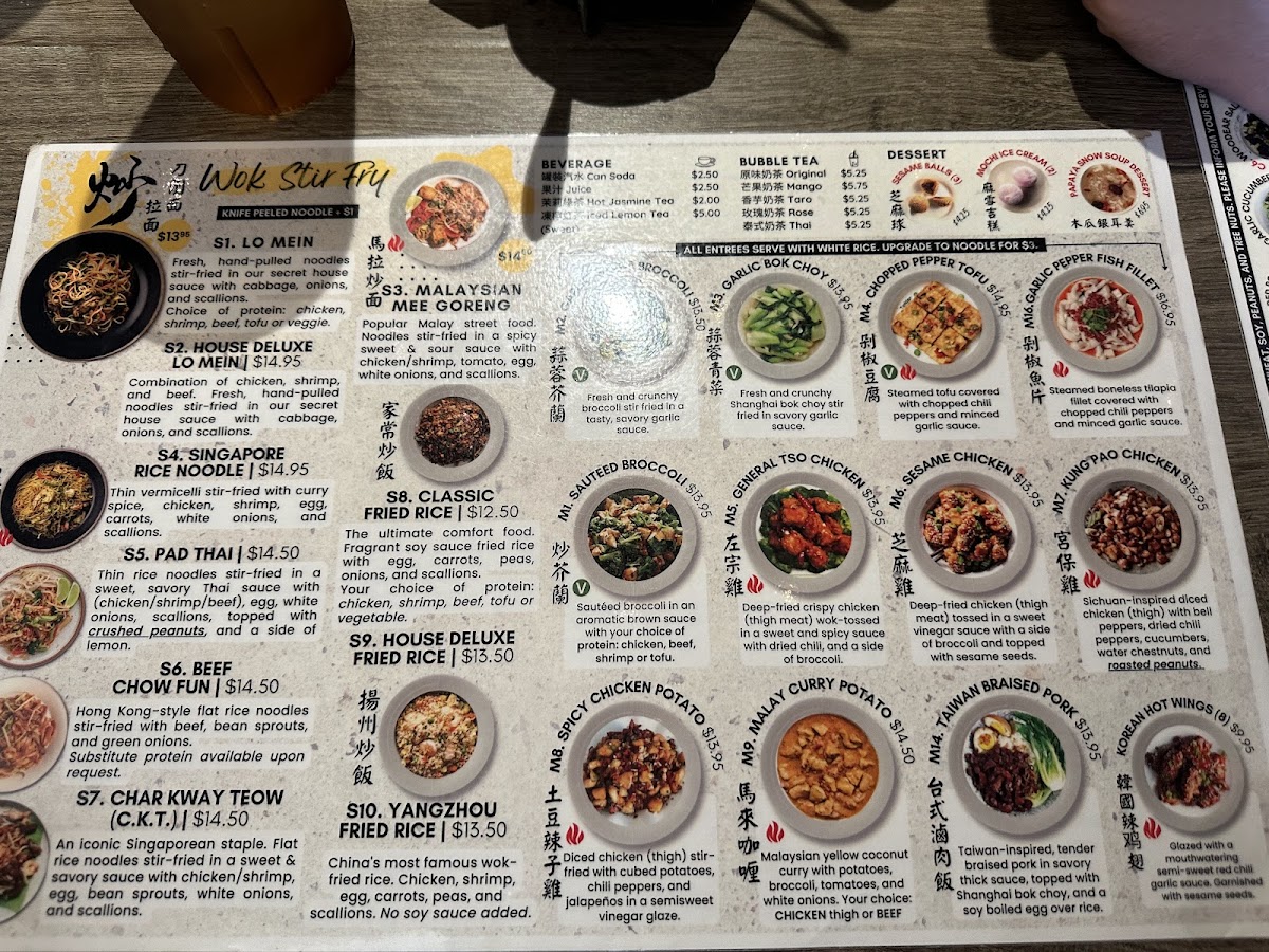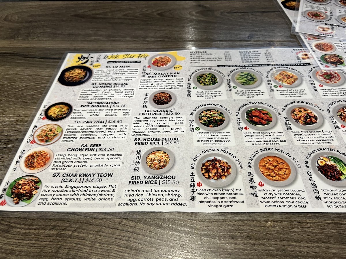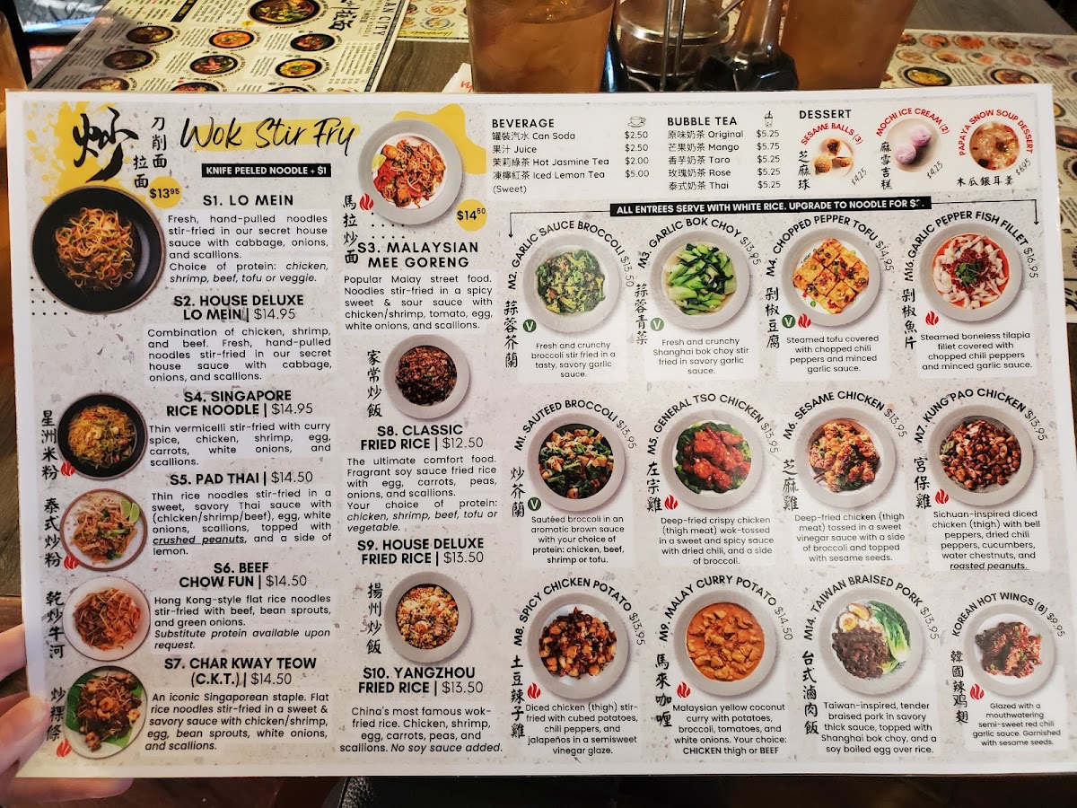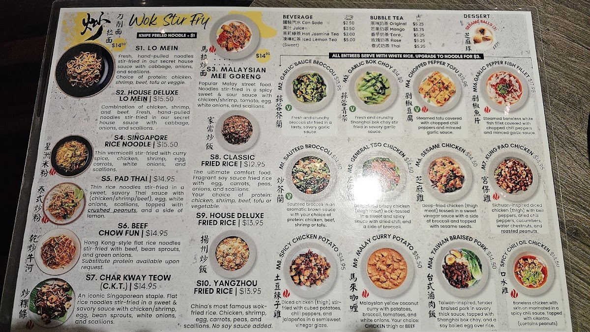 Main Dishes center on hand-pulled noodle bowls, including Pork Ribs Noodle Soup, Chong Qing Noodle with Pork, Beef Triple Knife Peeled Noodle, Dan Dan Sauce with Pork Noodle Bowl, and seafood-based Laksa Coconut Soup. Additional choices include Char Kway Teow, Ramen, Udon, and the House Deluxe Lo Mein. These noodles are typically served in broth or stir-fried preparations.