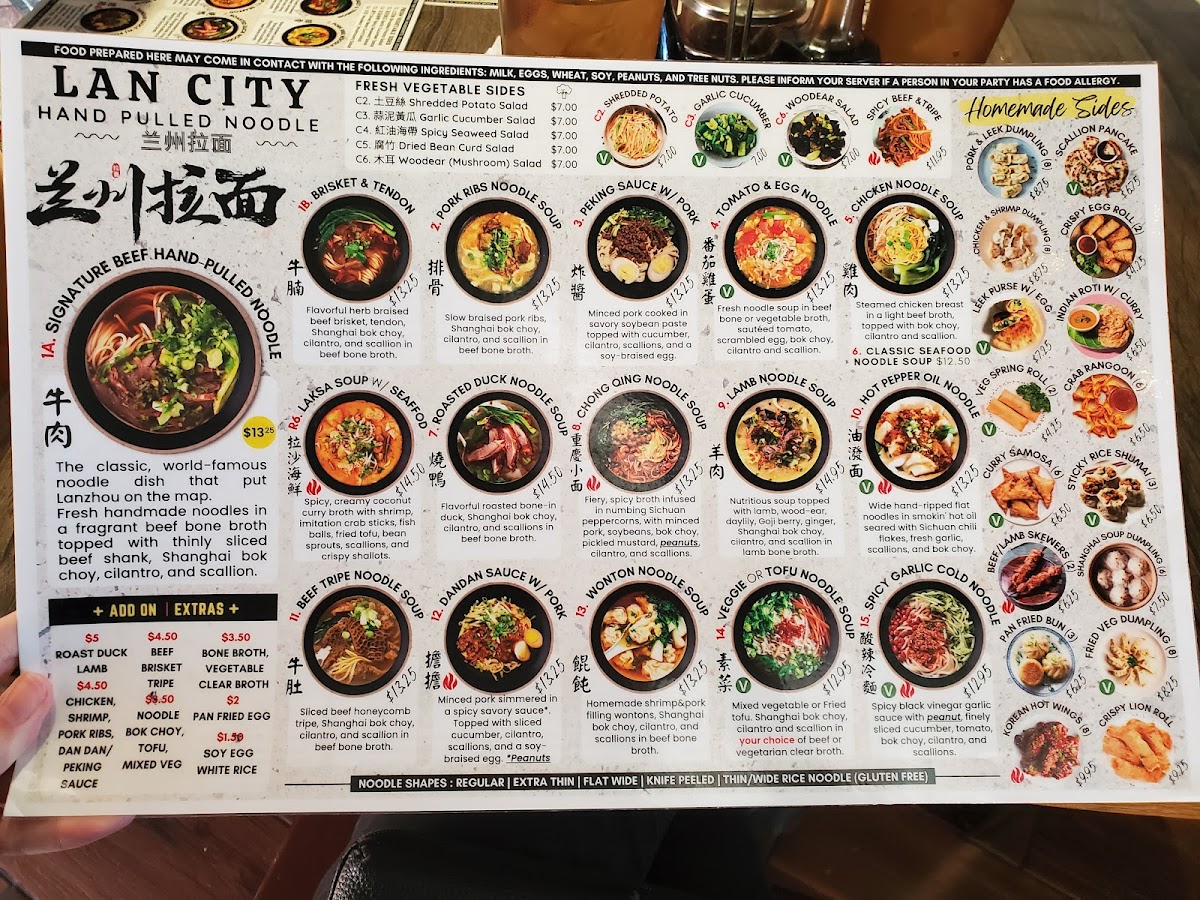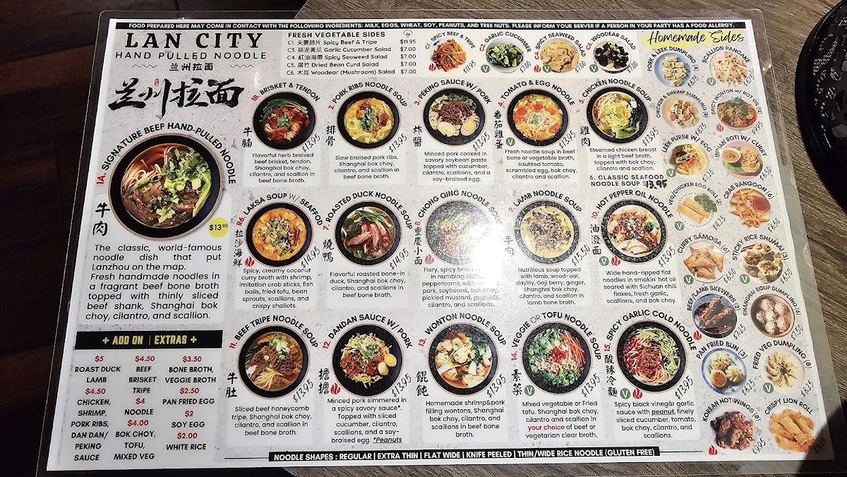 This menu is well-suited for casual dining, offering a range of noodle-based dishes accompanied by appetizers and cold sides that can accommodate both individual meals and shared plates. The hand-pulled noodles are a key feature, served with various proteins and flavor profiles to cater to different preferences.